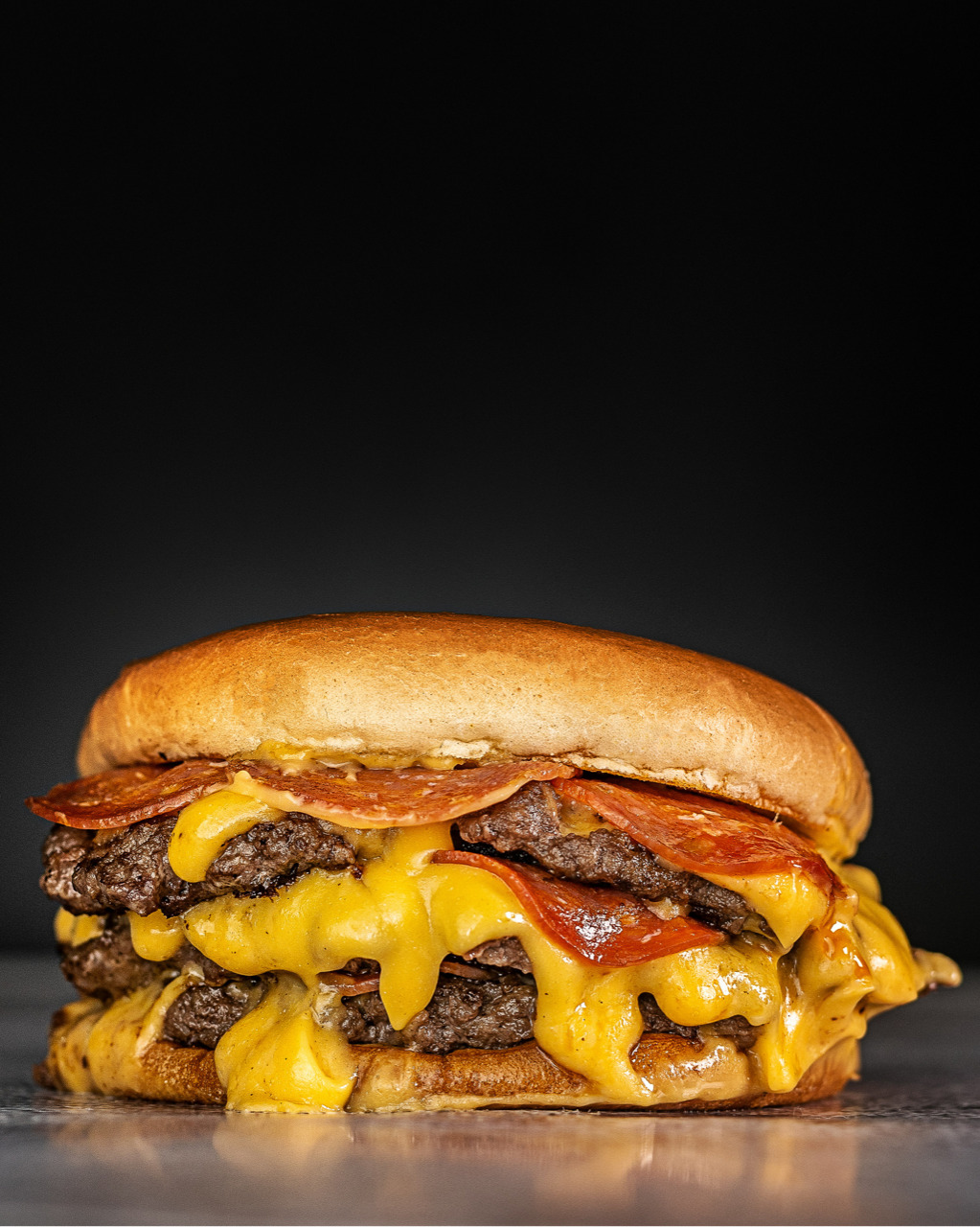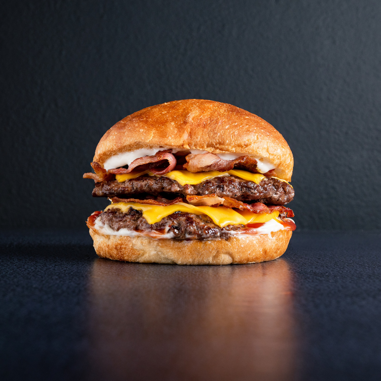10,75€Doble de carne de ternera de raza, queso cheddar, pepinillo agridulce, cebolla morada, lechuga, tomate, mantequilla, sal y pimienta negra molida.